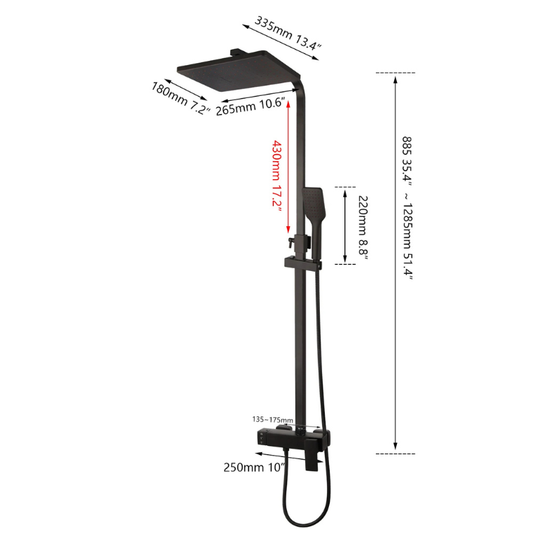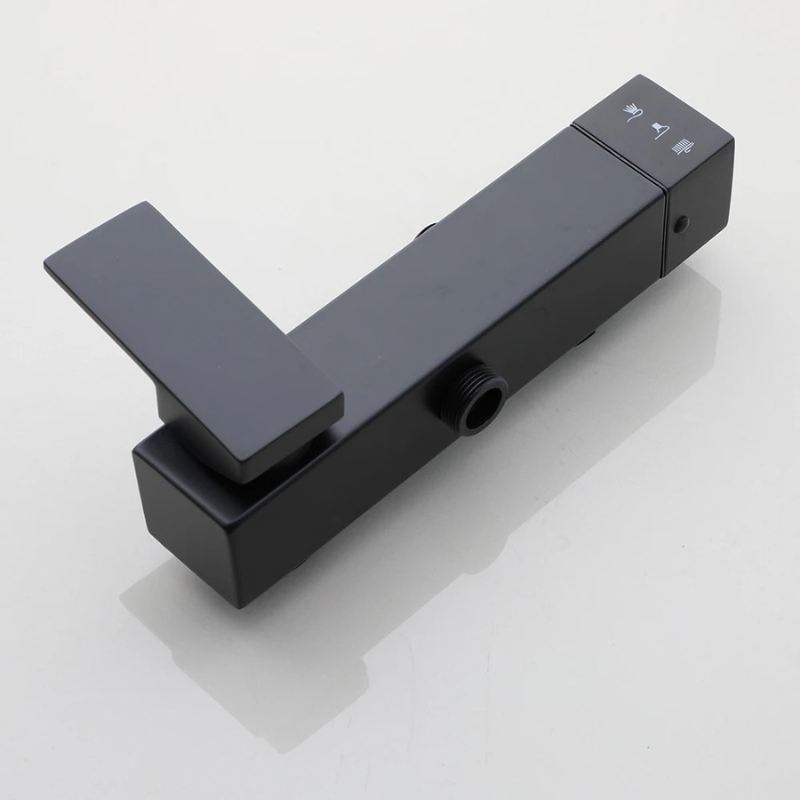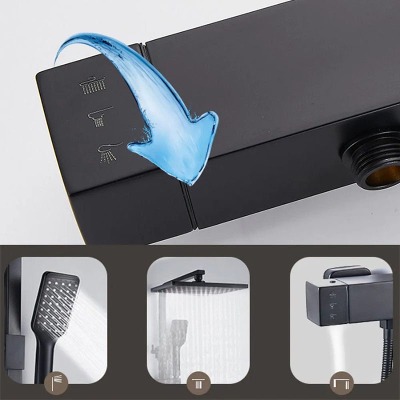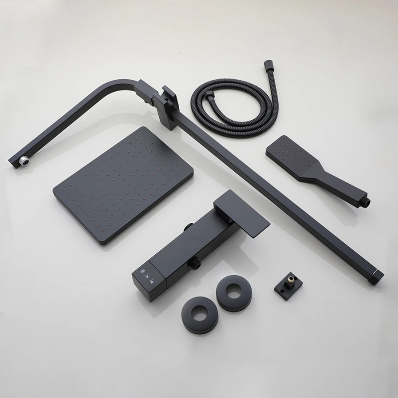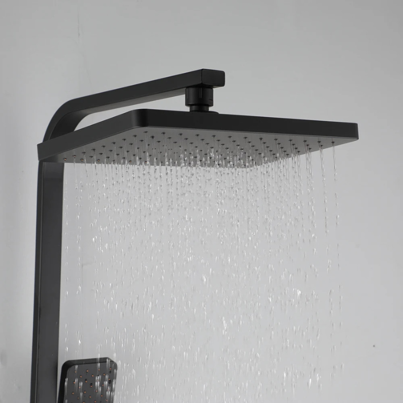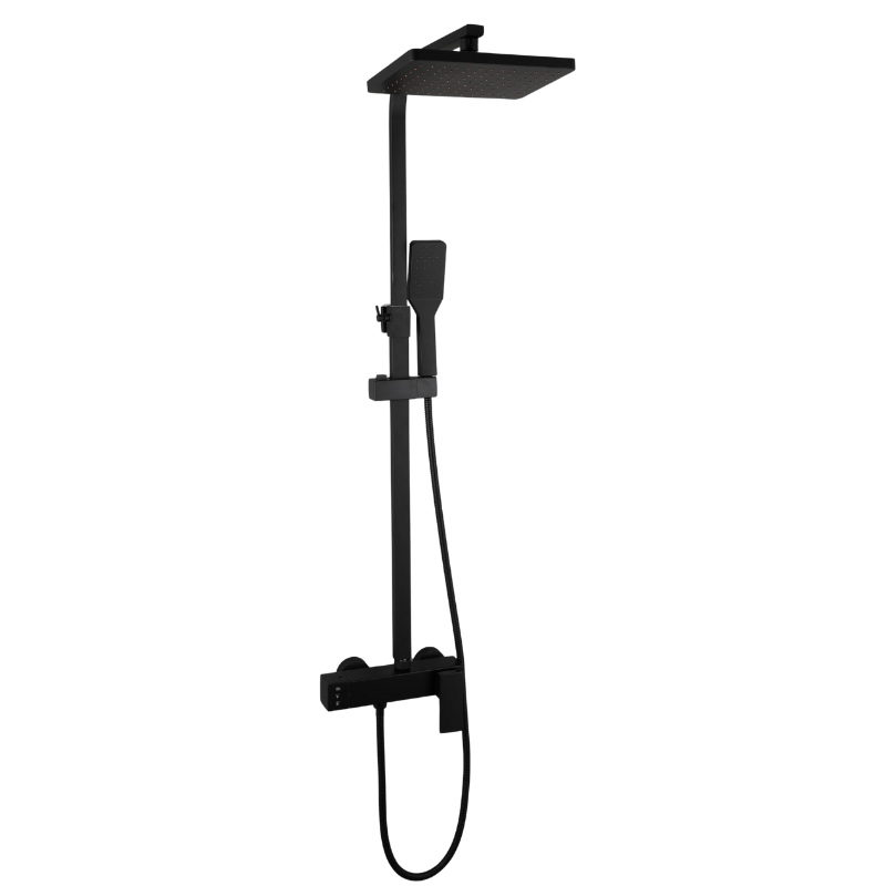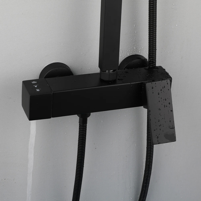 La colonne de douche carrée murale associe un pommeau supérieur carré, une douchette à main assortie et un système de commande unique dédié à l’eau chaude et froide. L’ensemble adopte une finition noire mate conforme aux visuels, avec un mitigeur à levier unique complété par un sélecteur séparé. La tête carrée se fixe sur une barre verticale et oriente un jet descendant, tandis que la douchette diffuse un jet directionnel. L’installation se réalise via deux points de fixation situés derrière le mitigeur.