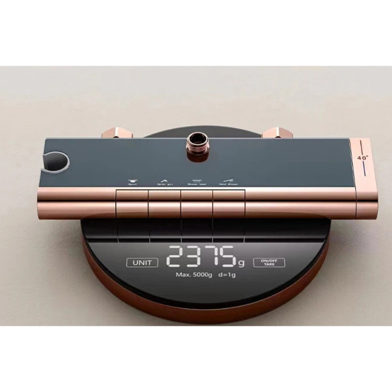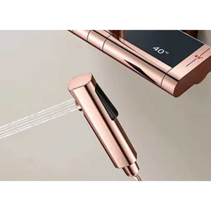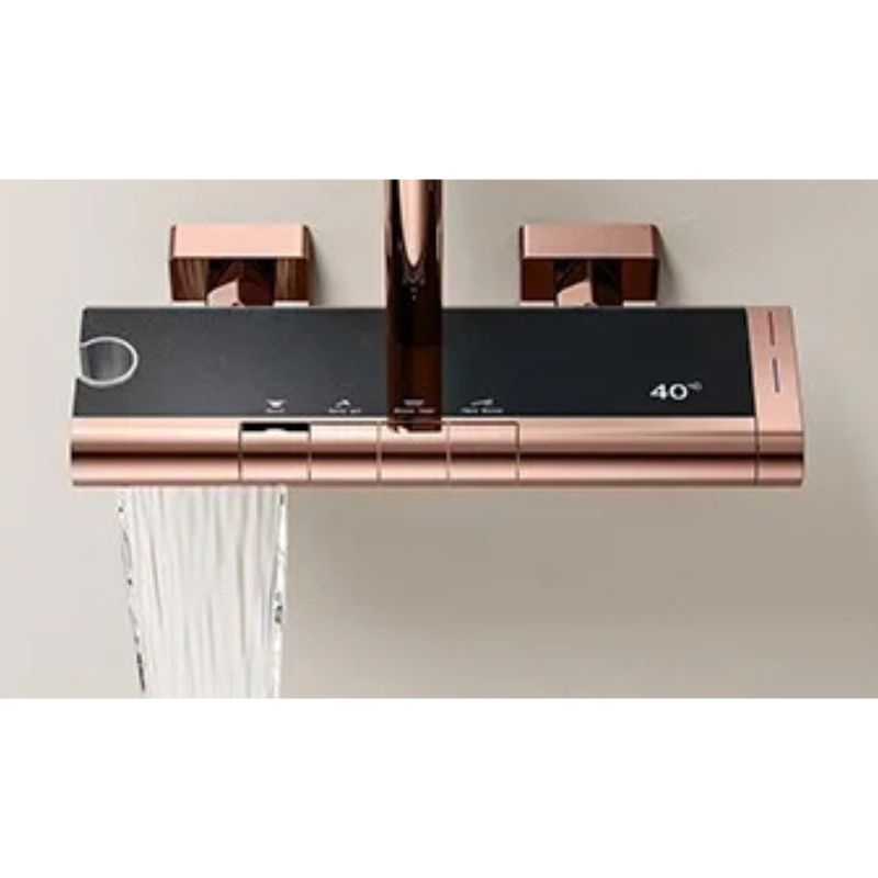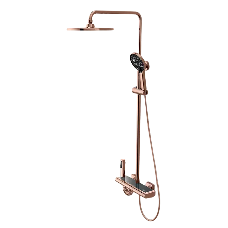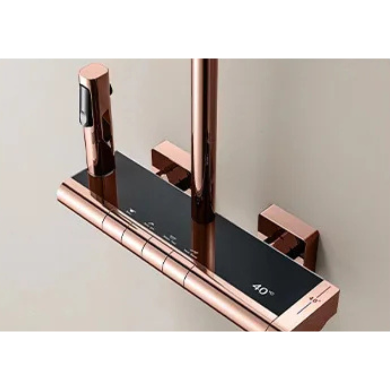 La colonne de douche cuivre 3 fonctions regroupe un ensemble mural composé d’une tête de douche ronde, d’une douchette à main au format cylindrique et d’un bec inférieur. L’ensemble repose sur un mitigeur mécanique à double poignée, chargé d’assurer la sélection de l’eau froide/chaude et l’aiguillage entre les différents postes.
