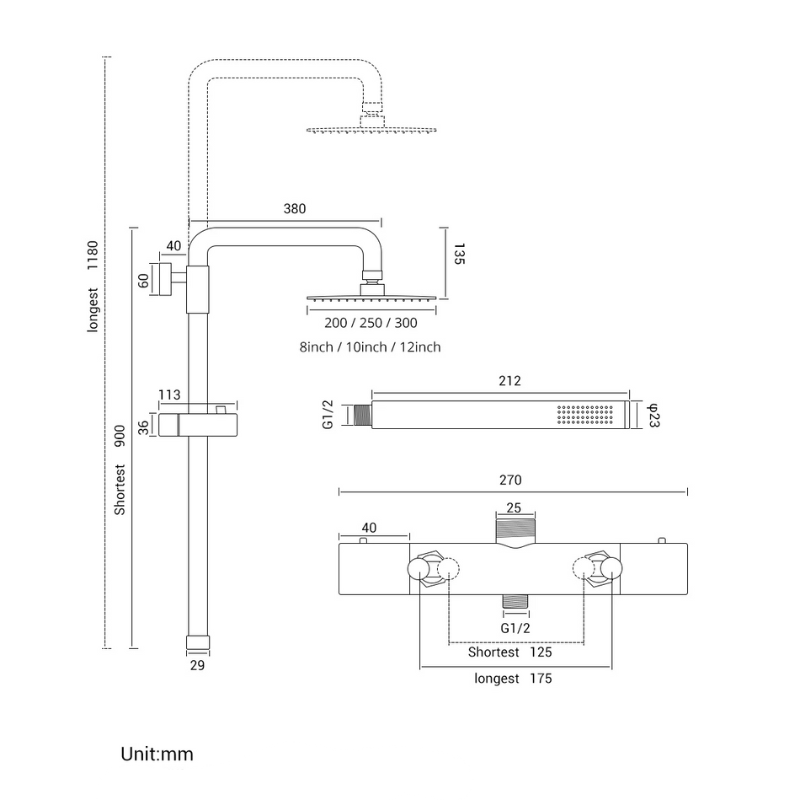 La tête de douche ronde est montée sur un bras mural droit en laiton, avec un disque disponible en plusieurs diamètres pour s’adapter aux configurations souhaitées. La douchette à main cylindrique est accompagnée d’un support mural et d’un flexible coordonné. Le mitigeur mécanique intègre deux poignées distinctes pour l’ajustement manuel de l’eau froide et chaude. L’installation est prévue en montage mural encastré partiel ou apparent selon la structure du mur.