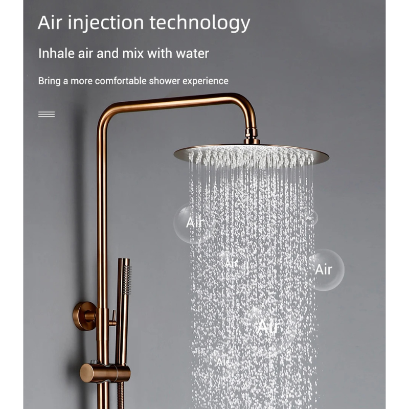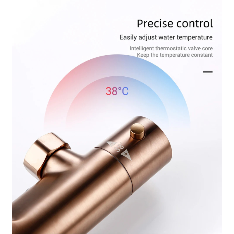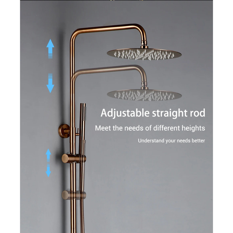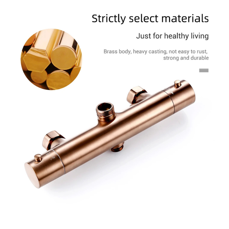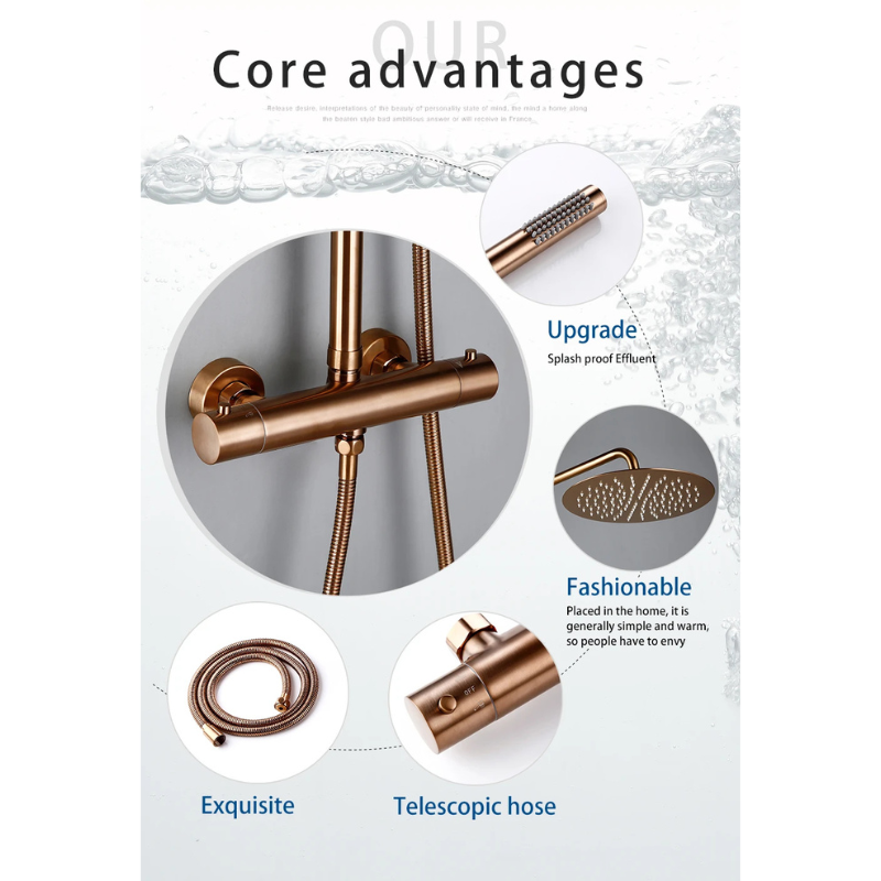 La colonne de douche cuivre mécanique regroupe une tête de douche ronde fixée sur un bras mural, une douchette à main cylindrique montée sur support mural, un flexible assorti et un mitigeur mécanique double poignée. L’ensemble adopte une finition cuivre poli avec corps en laiton et une cartouche interne en céramique dédiée au contrôle manuel de l’eau froide et chaude.
