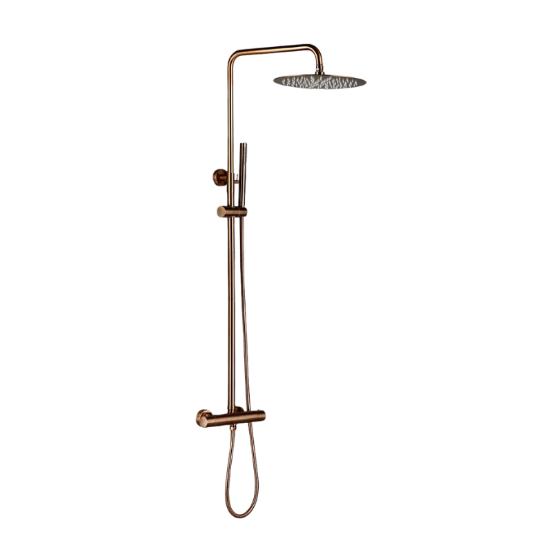 Une colonne de douche en cuivre mécanique avec tête ronde murale et douchette cylindrique assortie