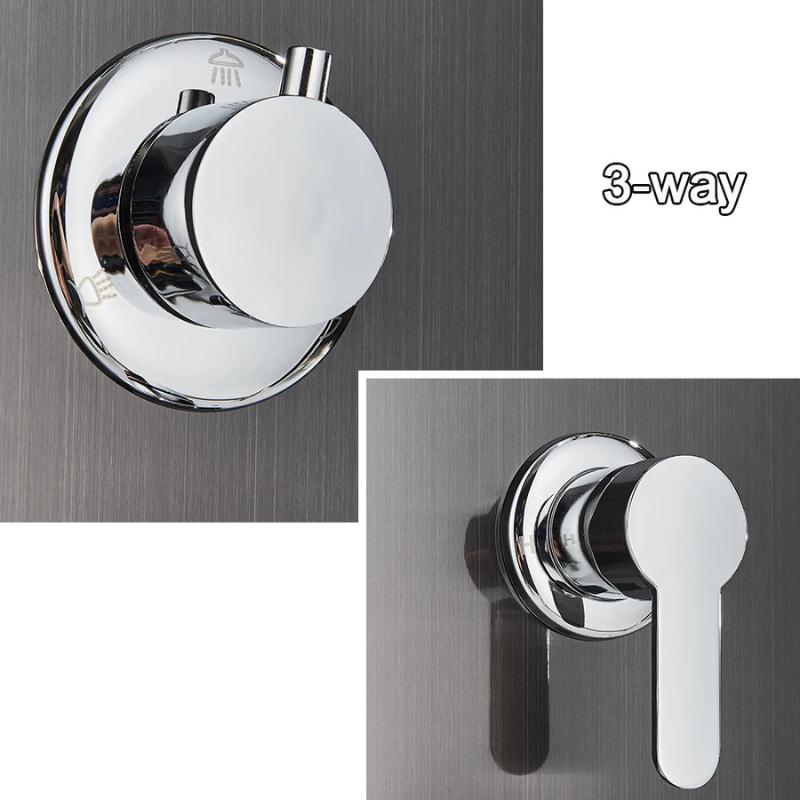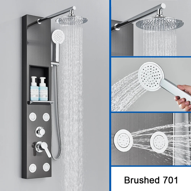 La colonne de douche hydromassante avec rangement est conçue autour d’un panneau vertical en acier inoxydable brossé intégrant une niche ouverte pour organiser les produits de douche. L’ensemble regroupe une tête de douche ronde montée sur bras mural, une douchette à main perforée, quatre buses hydromassantes et une commande unique permettant d’ajuster la distribution d’eau chaude et froide. Le traitement de surface brossé assure une apparence uniforme et sobre, tandis que le panneau accueille directement les éléments fonctionnels et l’espace de rangement.