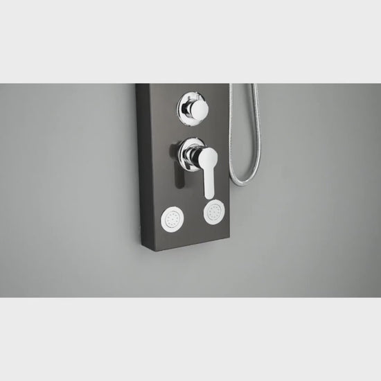 Le panneau comprend une tête ronde orientée vers le bas, une douchette manuelle raccordée par flexible et quatre buses hydromassantes réparties sur la surface frontale. La niche rectangulaire accueille les produits d’hygiène courants et s’insère directement dans la structure. Une poignée unique assure le réglage du débit ainsi que la sélection entre les différentes sorties. Les éléments visibles, comme les jets circulaires ou les perforations de la tête murale.