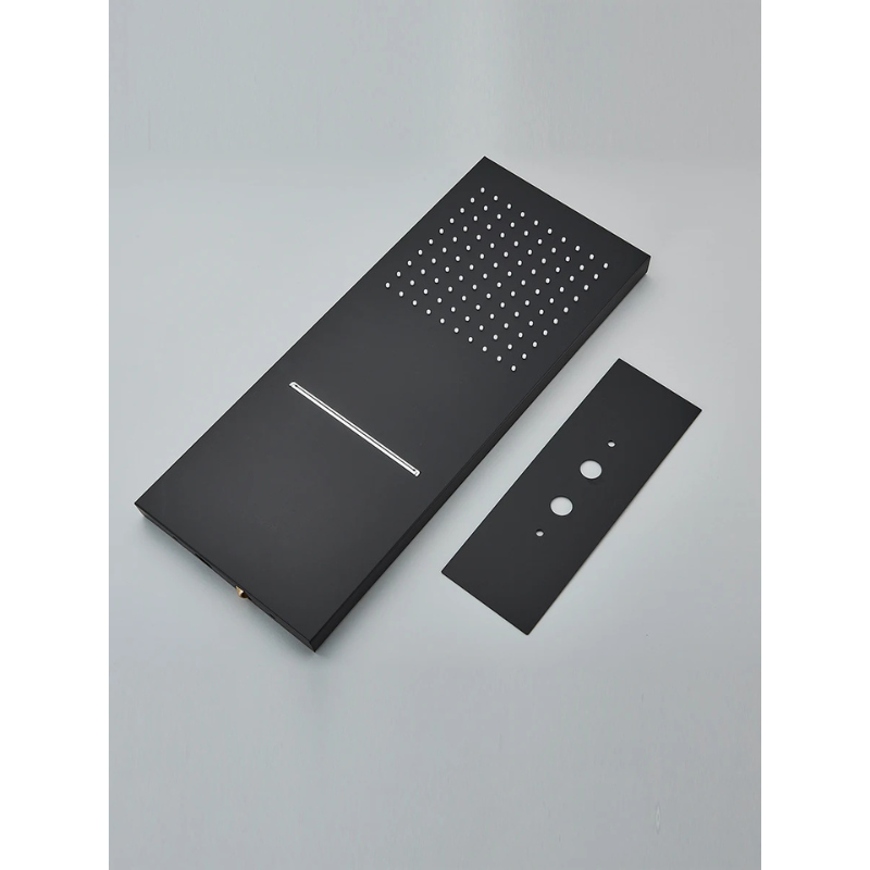 La colonne de douche noire cascade réunit une tête rectangulaire murale avec fonction pluie, une sortie cascade intégrée et une douchette rectangulaire assortie. L’ensemble inclut un mitigeur thermostatique à trois poignées permettant l’activation séparée de chaque voie d’eau. La construction utilise du laiton pour les éléments structurels, avec un traitement de surface noirci ou or brossé selon la variante choisie.