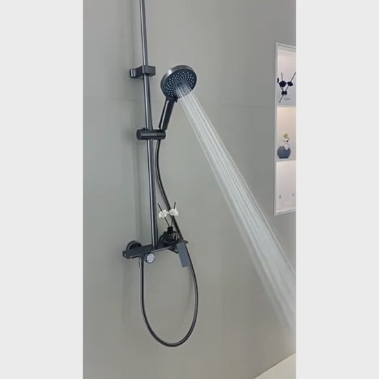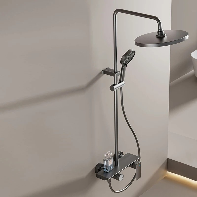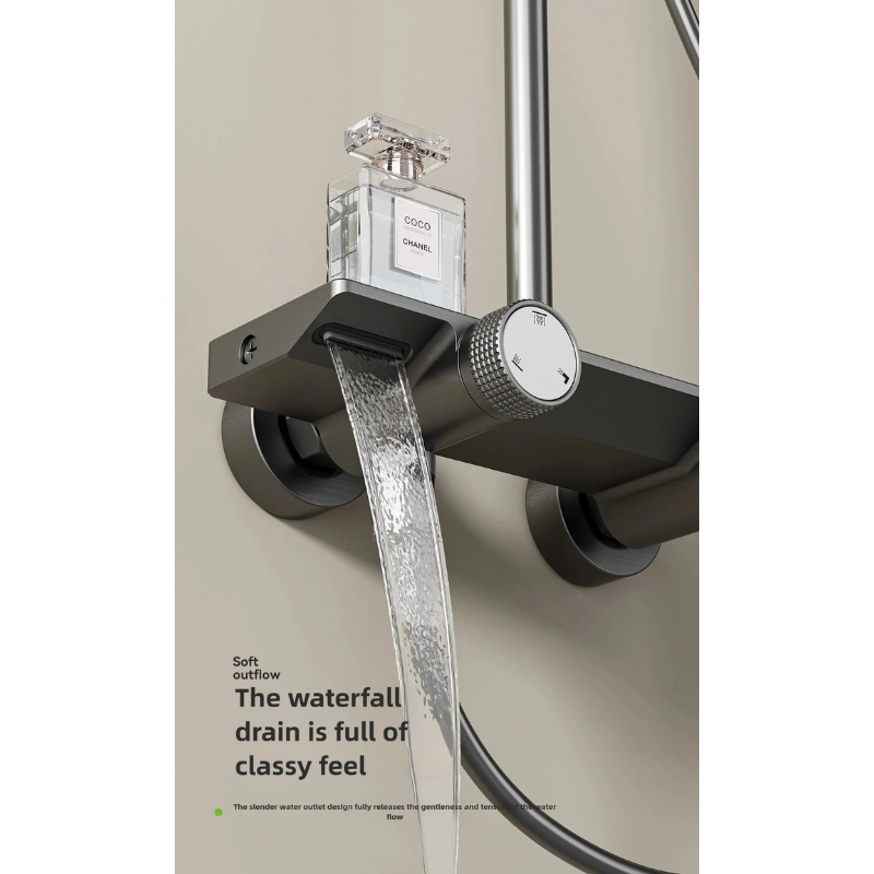 La colonne dispose d’une tête ronde de grand diamètre montée sur un bras coudé, avec orientation ajustable. La douchette à main est fixée sur un support coulissant réglable en hauteur. La commande rotative permet de sélectionner les différents modes d’écoulement, et la poignée principale gère l’eau chaude et l’eau froide. La tablette supérieure forme une surface plane pouvant accueillir de petits accessoires du quotidien.