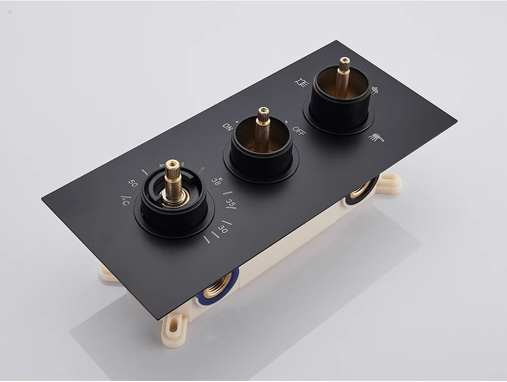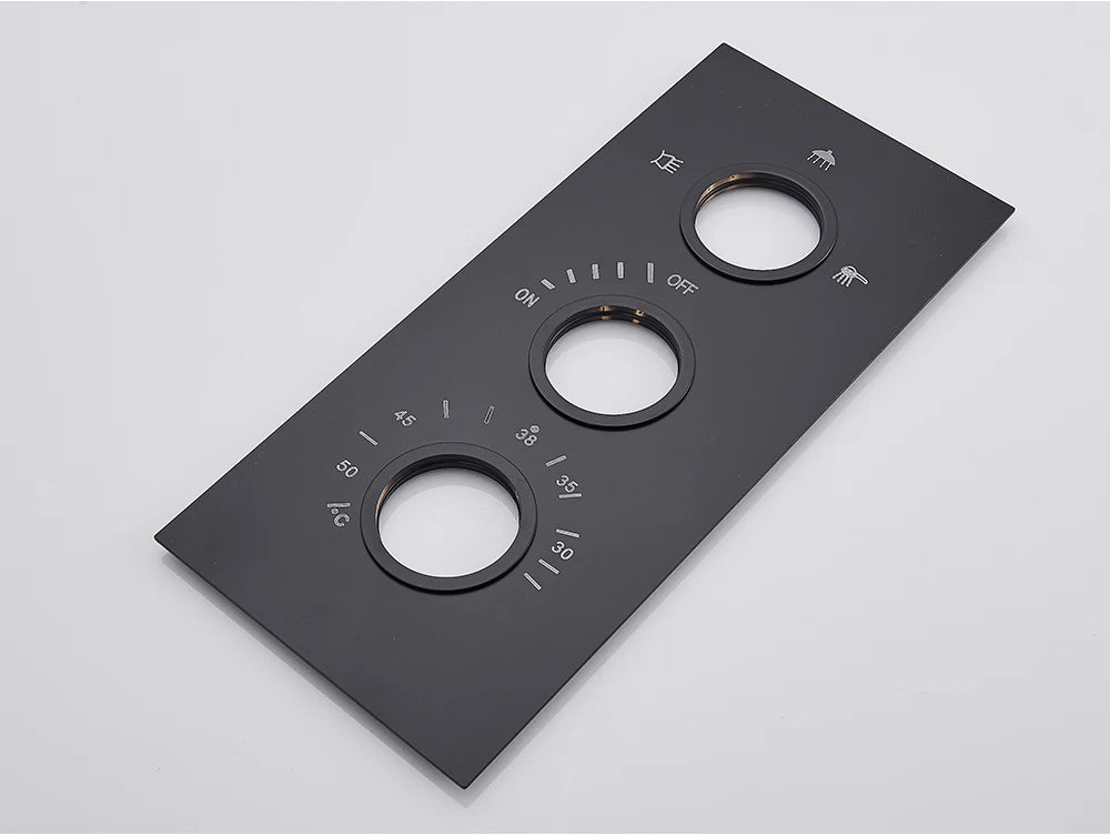 Le mitigeur thermostatique 3 voies est conçu pour une installation murale encastrée. La façade se présente sous la forme d’une plaque rectangulaire intégrant trois commandes distinctes, disposées verticalement. L’ensemble est proposé en plusieurs couleurs, visibles. Le format encastré permet une intégration directe dans le mur, avec uniquement les commandes accessibles en surface.