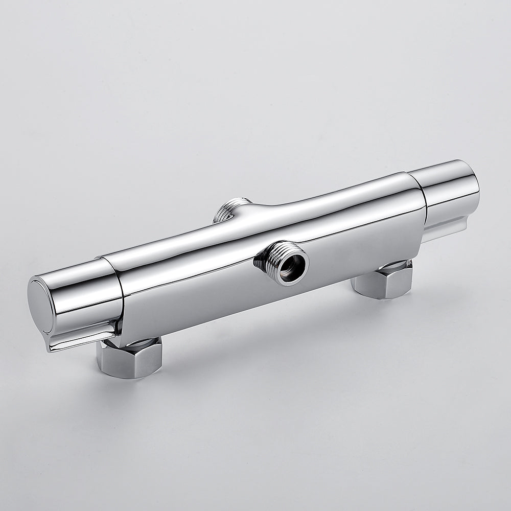 Le mitigeur thermostatique douche est conçu pour une installation murale avec support fixe. Le corps est en laiton avec un traitement de surface poli, visible sur l’ensemble des éléments. Le mitigeur présente une configuration horizontale avec deux poignées distinctes et une sortie centrale destinée à la connexion d’un équipement de douche.