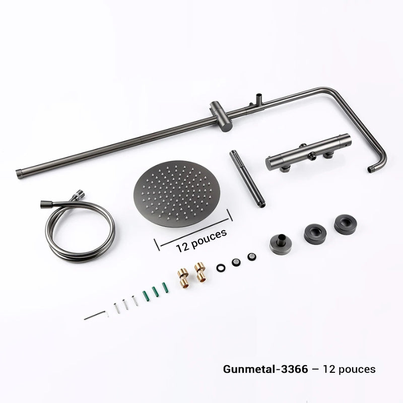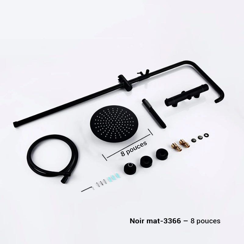 La colonne de douche avec mitigeur pluie s’appuie sur un système thermostatique équipé d’un double levier et d’un contrôle automatique de la température. L’ensemble réunit un pommeau supérieur rond, une douchette à main et une barre verticale ajustable permettant de modifier la hauteur selon les besoins. Le corps principal est conçu en laiton avec une finition polie, et le module thermostatique maintient une température stable autour de 38°C pour un usage régulier.