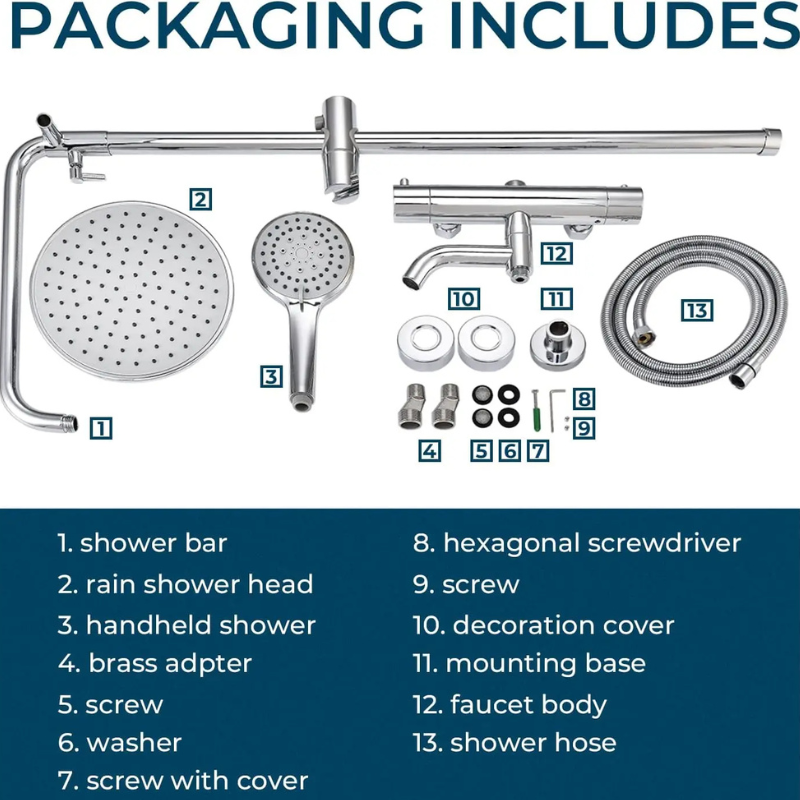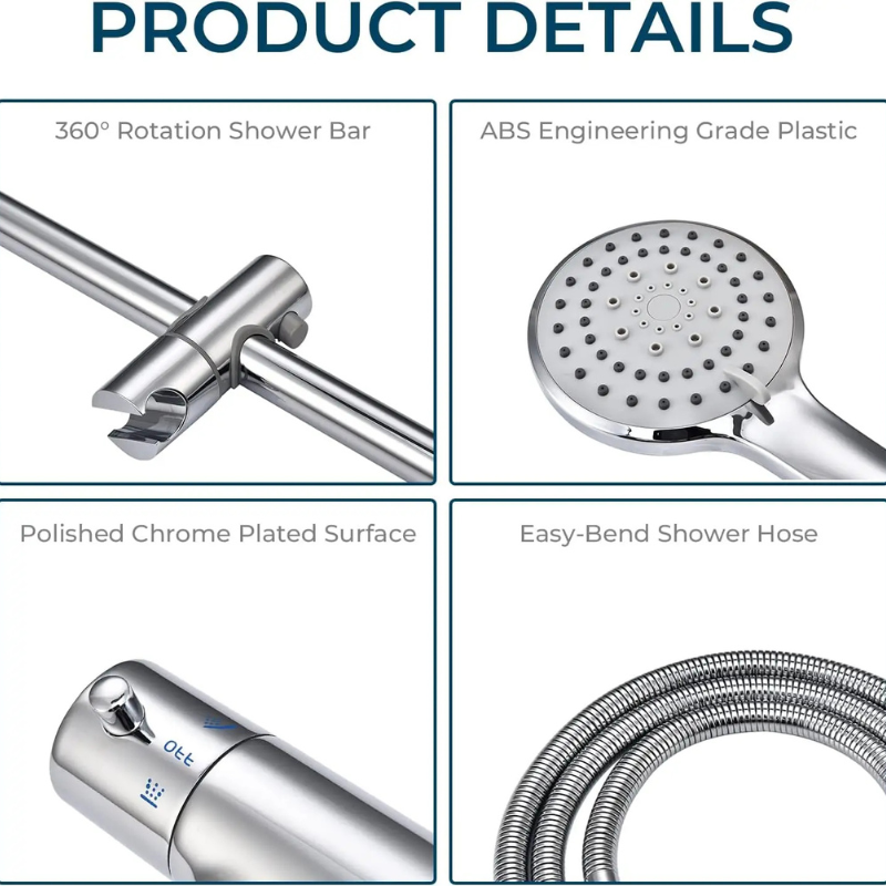 Le mitigeur thermostatique régule automatiquement l’eau chaude et froide à l’aide d’une poignée dédiée. La douchette à main propose trois types de jets distincts, tandis que la tête ronde fixe complète la partie supérieure du système. La barre verticale est équipée d’un support coulissant permettant d’ajuster la position de la douchette, avec possibilité de rotation selon l’angle souhaité par l’utilisateur.