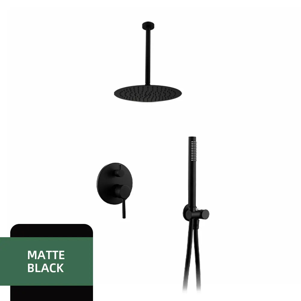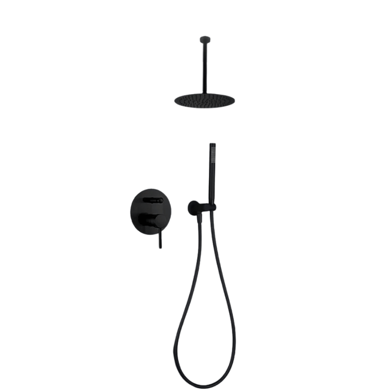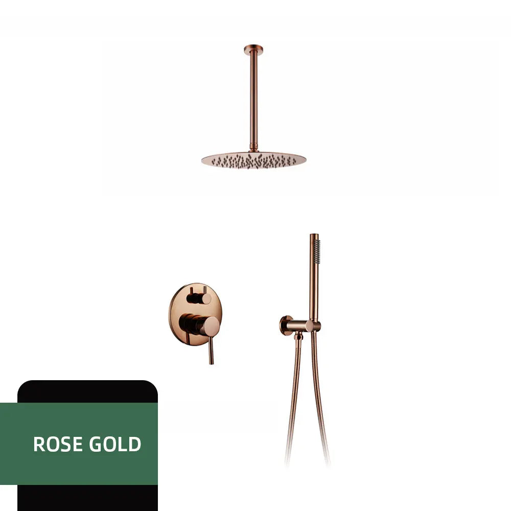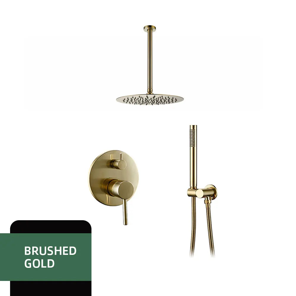 La colonne de douche encastrable bras de plafond intègre une tête de douche ronde montée verticalement, un mitigeur mural à double commande et une douchette à main cylindrique. L’ensemble est conçu pour une installation totalement intégrée, avec un bras de plafond d'environ 30 cm et une tête ronde disponible en 20 cm, 25 cm ou 30 cm selon la configuration. L’esthétique reste uniforme grâce aux finitions proposées : noir mat, or brossé, or rose ou chrome.