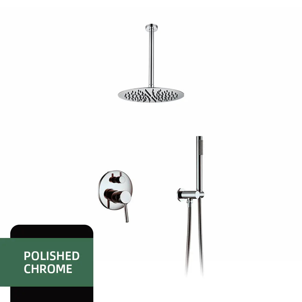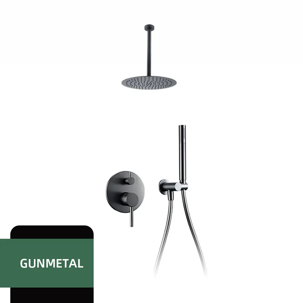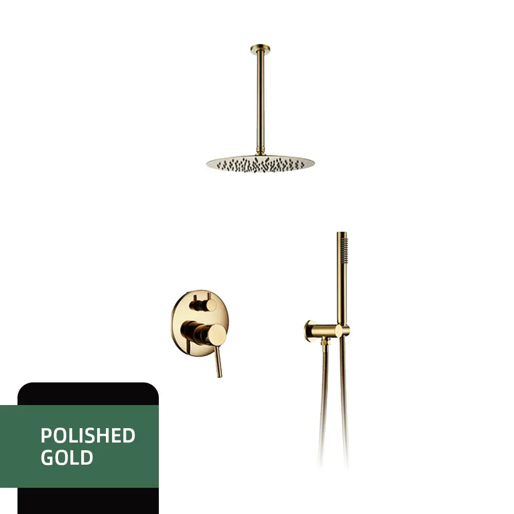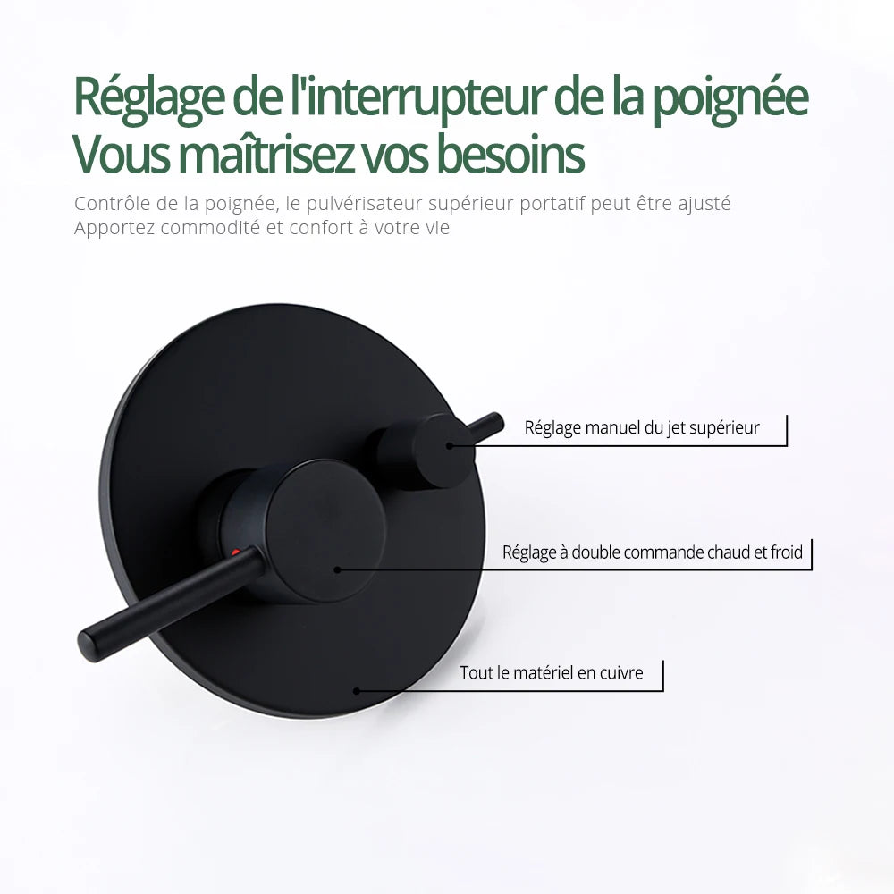 La colonne de douche encastrable bras de plafond intègre une tête de douche ronde montée verticalement, un mitigeur mural à double commande et une douchette à main cylindrique. L’ensemble est conçu pour une installation totalement intégrée, avec un bras de plafond d'environ 30 cm et une tête ronde disponible en 20 cm, 25 cm ou 30 cm selon la configuration. L’esthétique reste uniforme grâce aux finitions proposées : noir mat, or brossé, or rose ou chrome.