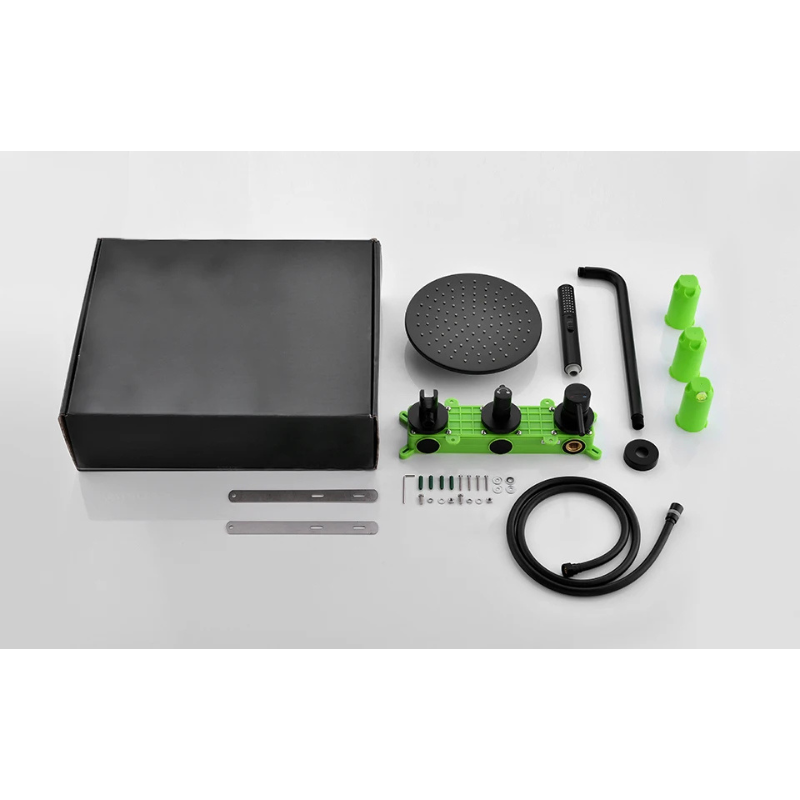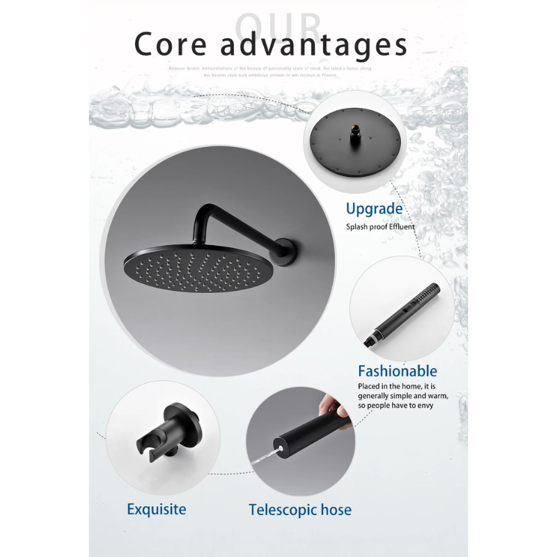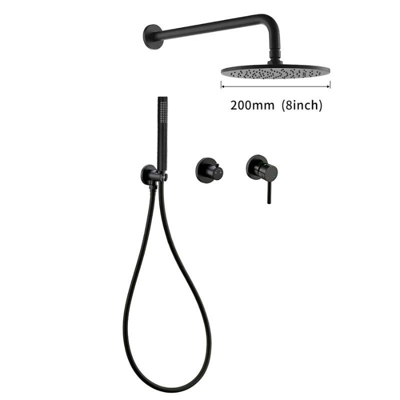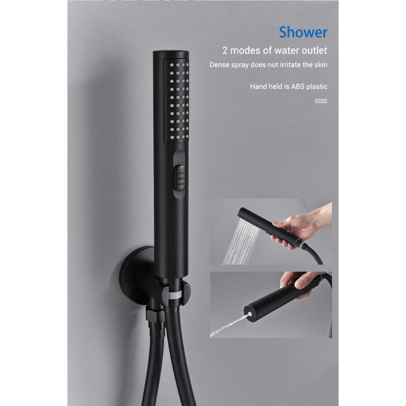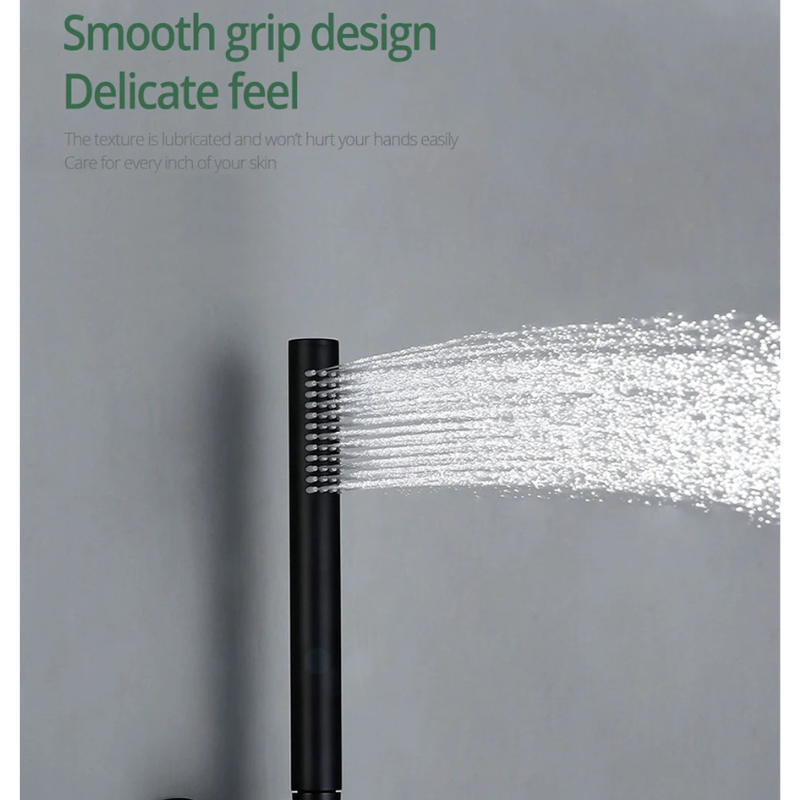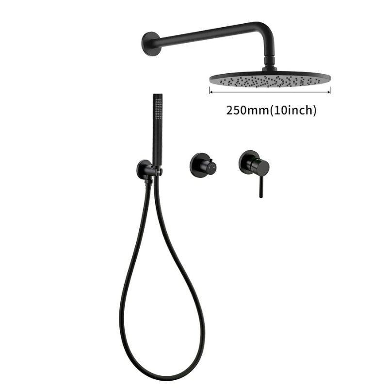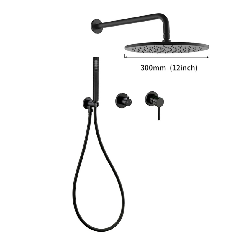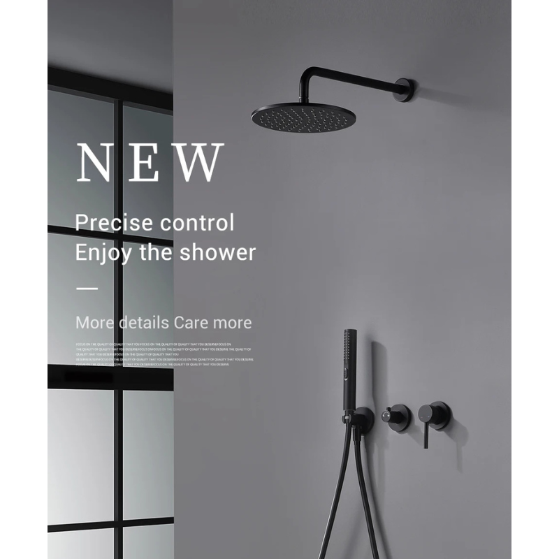 La colonne de douche encastrable style pluie regroupe un bras mural noir mat, une tête de douche ronde positionnée en hauteur et une douchette à main assortie. L’ensemble est conçu pour une installation murale encastrée, avec deux commandes distinctes permettant la gestion de l’eau chaude et froide, ainsi que la sélection entre la tête de douche et la douchette à main. La finition noire mate assure une apparence uniforme sur toutes les pièces visibles.