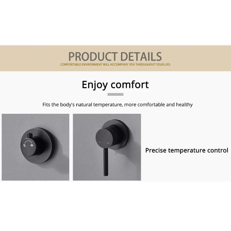 Les deux commandes murales assurent un réglage séparé des températures chaude et froide, tandis que le second sélecteur permet de passer d’un jet pluie à la douchette à main. La tête de douche ronde est montée sur un bras mural droit et la douchette à main est fournie avec un flexible de 150 cm, permettant une utilisation plus ciblée. Le panneau mural circulaire montre clairement les deux commandes et reste aligné avec l’esthétique minimaliste du set.