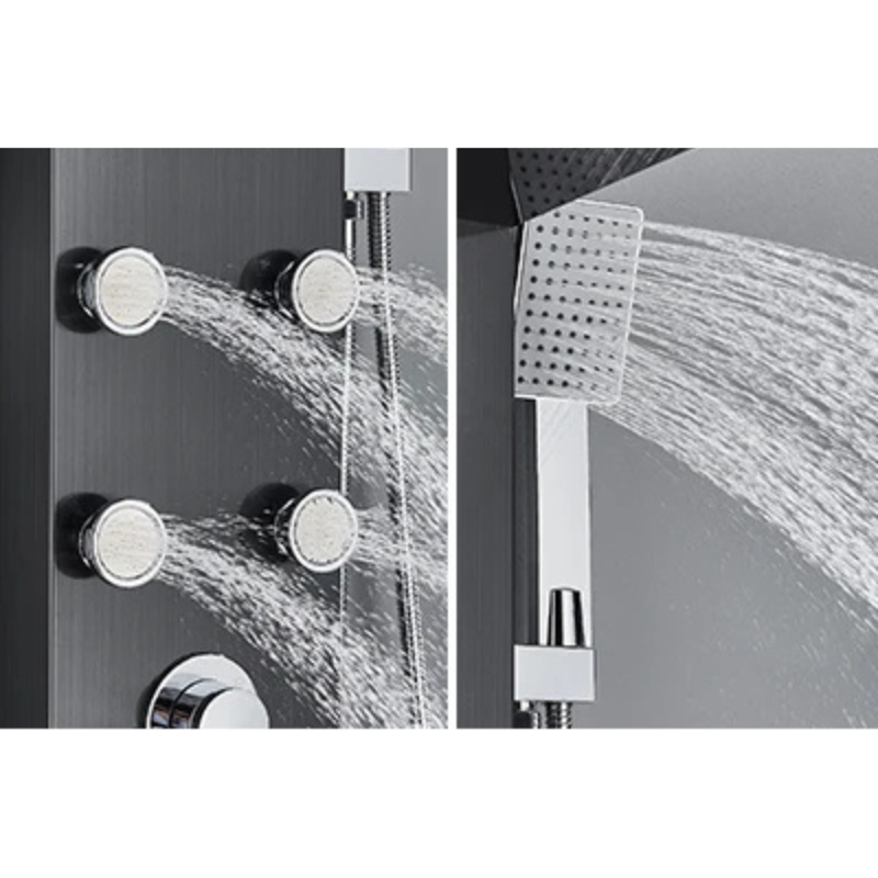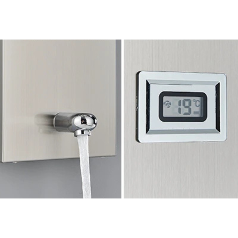 La colonne de douche hydromassante affichage numérique combine une façade murale en acier inoxydable, une tête de douche rectangulaire intégrée et une douchette à main, le tout avec un panneau frontal accueillant plusieurs commandes rotatives. Les photos montrent une tête pluie rectangulaire avec un écoulement vertical et un écoulement en lame, plusieurs buses latérales réparties sur la façade, un bec inférieur pour le remplissage d’appoint, ainsi qu’un écran numérique indiquant la température. L’ensemble repose sur un système thermostatique à triple commande, associé à un noyau de valve céramique confirmé dans les données techniques. La surface est indiquée comme acier inoxydable avec un traitement noirci selon les variantes visibles.