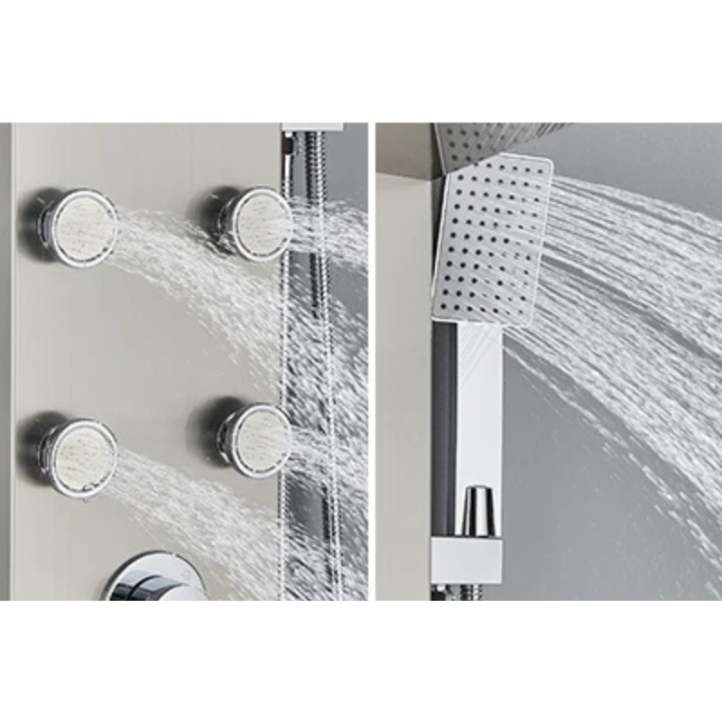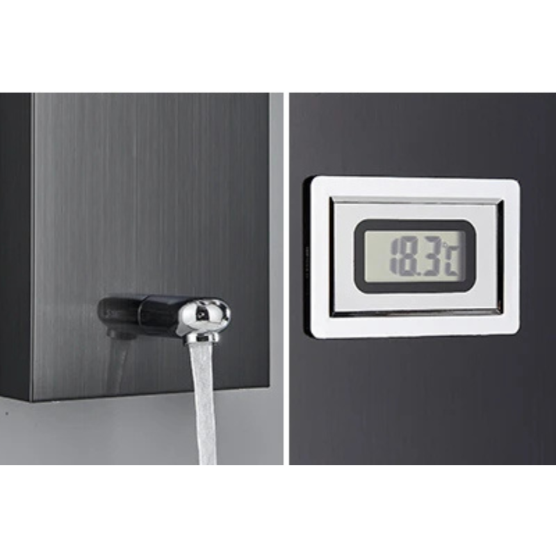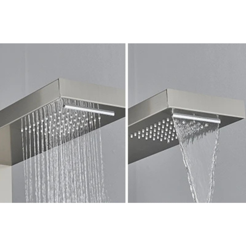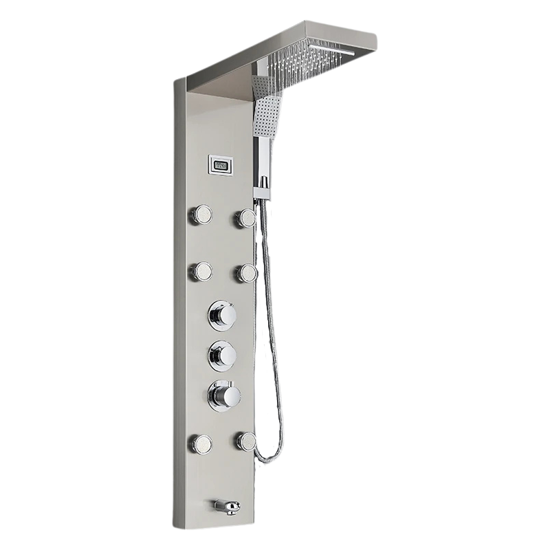 Une colonne de douche hydromassante à affichage numérique avec tête pluie rectangulaire et buses intégrées