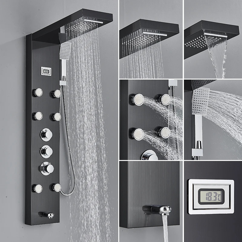 La structure murale regroupe trois poignées rotatives dédiées au réglage de la température et à la sélection des sorties visibles : tête pluie supérieure, buses hydromassantes et douchette à main. Le design rectangulaire de la tête pluie offre deux sorties distinctes : un jet vertical classique et une chute d’eau dirigée vers l’avant. La douchette à main est accompagnée d’un flexible et d’un support mural, et le panneau frontal intègre plusieurs sorties circulaires destinées à la diffusion d’eau en façade. L’écran numérique intégré fournit une lecture directe de la température, telle qu’observée sur les visuels.