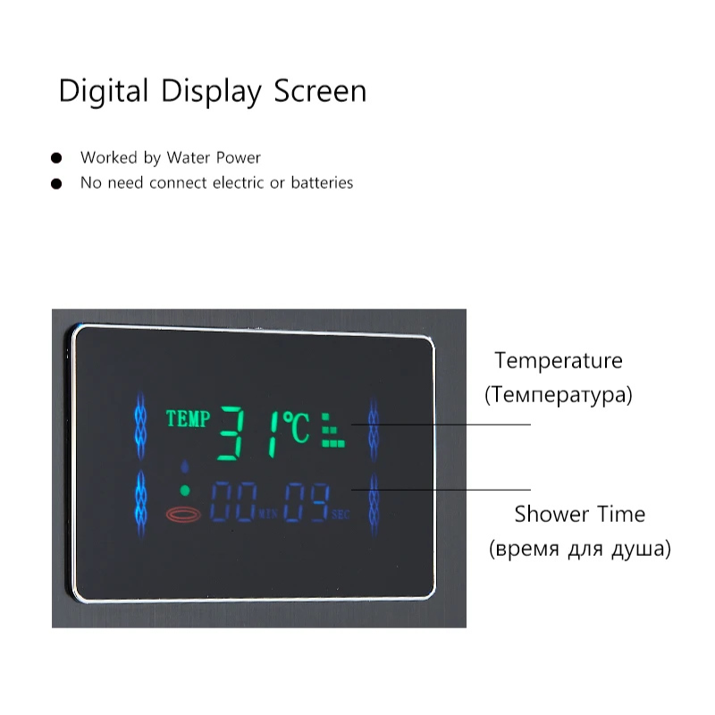 Écran numérique indiquant température et minuterie, fonctionnant grâce au débit d’eau