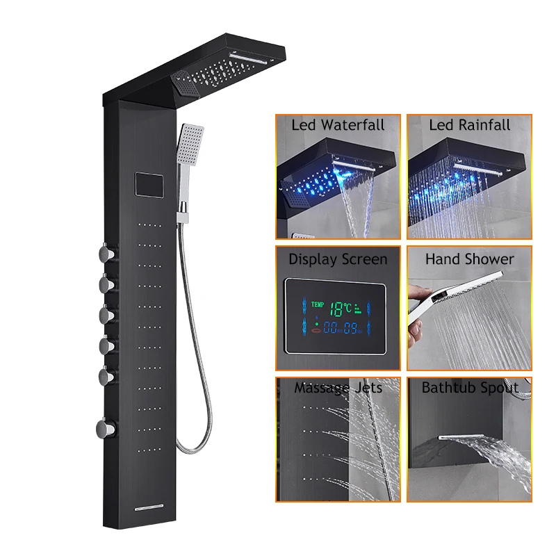 La colonne de douche hydromassante multi jets regroupe une tête de douche horizontale intégrée, un robinet cascade, une douchette à main rectangulaire, plusieurs buses hydromassantes alignées et un afficheur numérique alimenté par le passage de l’eau. L’ensemble repose sur une structure murale en acier inoxydable avec finition brossée ou noircie selon la variante visible. Le panneau est équipé d’une commande indépendante pour chaque fonction et d’un sélecteur d’eau chaude et froide.