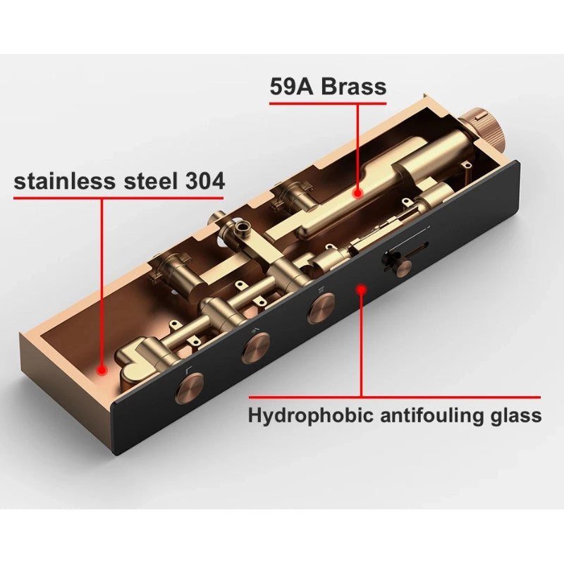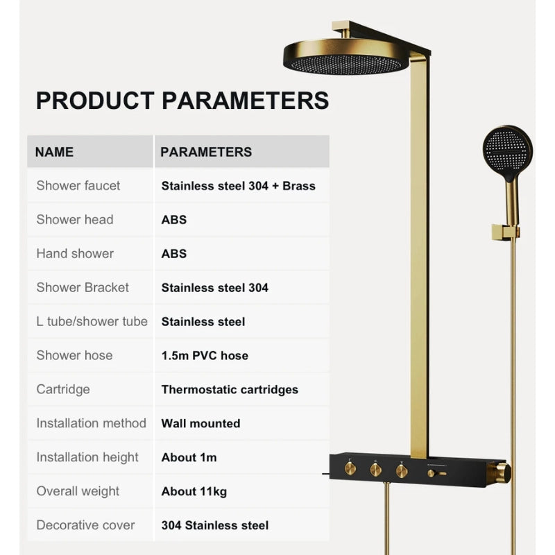 La colonne de douche Colonne de douche thermostatique moderne présente un ensemble mural combinant une douche supérieure large, une douchette à main réglable et plusieurs commandes indépendantes. La structure repose sur un corps principal en acier inoxydable 304 et un module thermostatique en laiton 59A, permettant une gestion claire des sorties d’eau et une régulation stable de la température.
