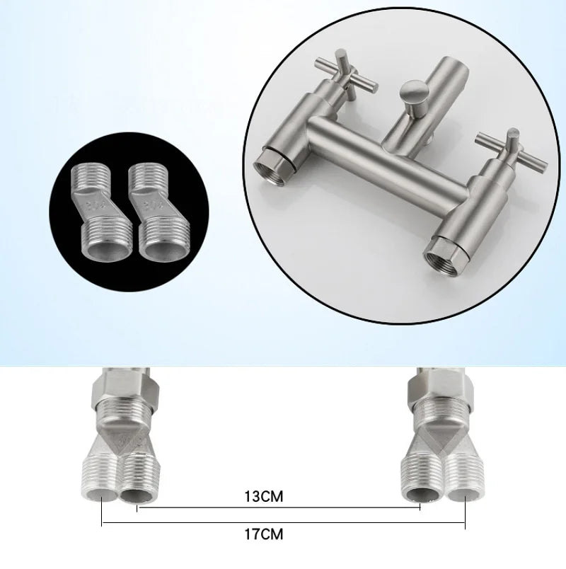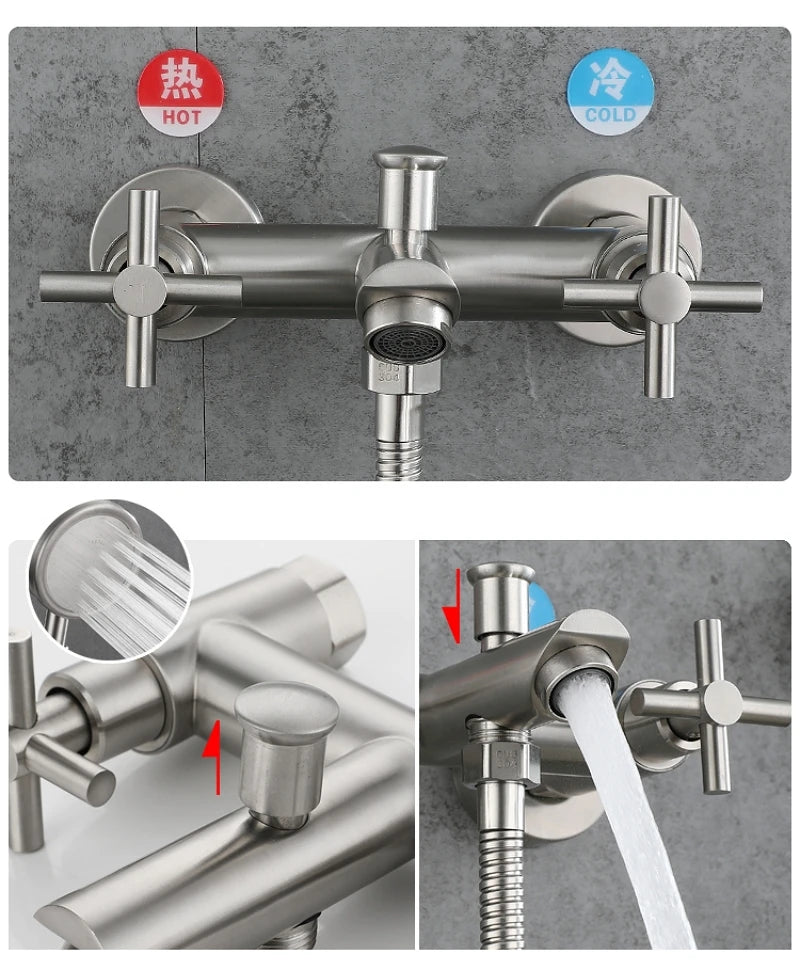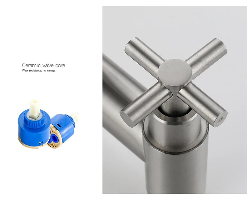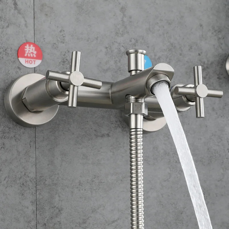 Le mitigeur baignoire croix est un robinet mural conçu pour une installation fixe avec deux poignées croisées latérales et un bec central. Le corps est fabriqué en acier inoxydable 304 avec une finition brossée, adaptée aux environnements de salle de bain contemporains. Le raccordement est prévu en standard G1/2".