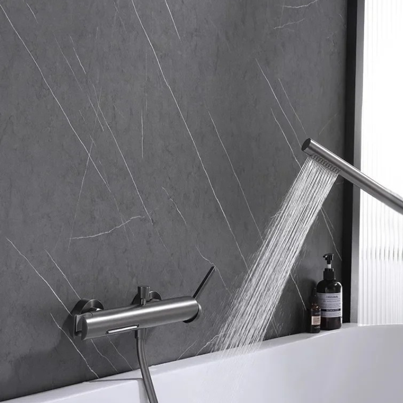 Le mitigeur baignoire or est conçu pour une installation murale avec support fixe. L’ensemble se compose d’un corps en laiton, d’un bec de baignoire orienté vers la cuve et d’une sortie dédiée à une douchette à main. La commande unique permet de gérer l’ouverture de l’eau ainsi que le réglage de la température chaude et froide.