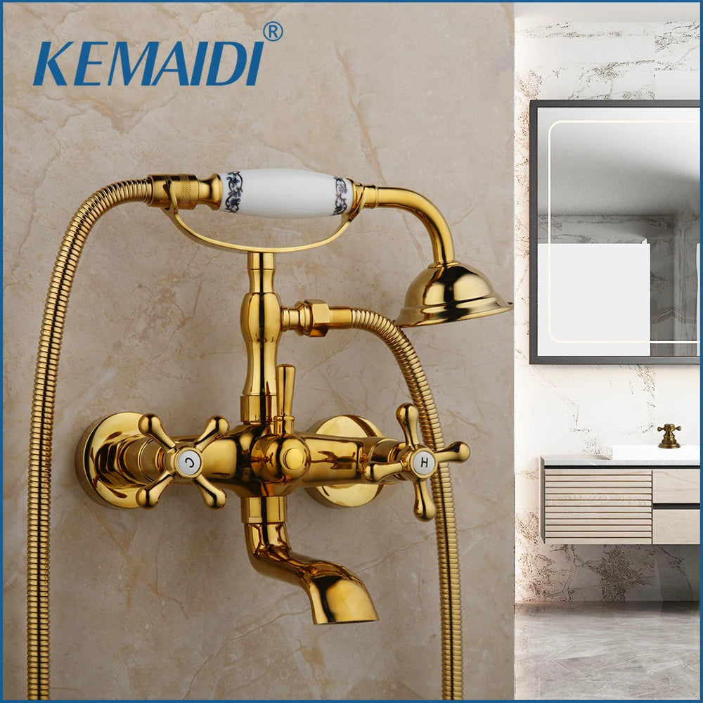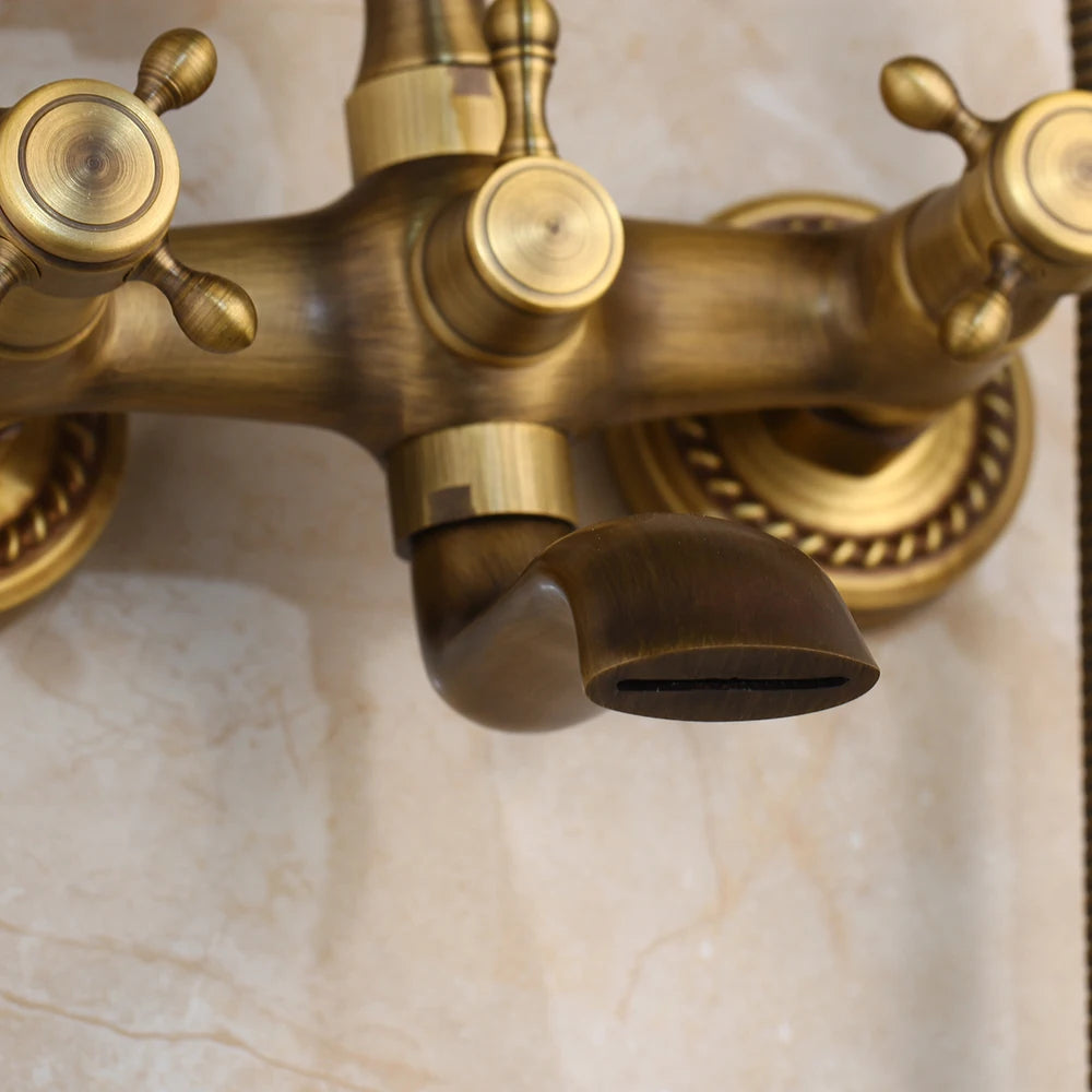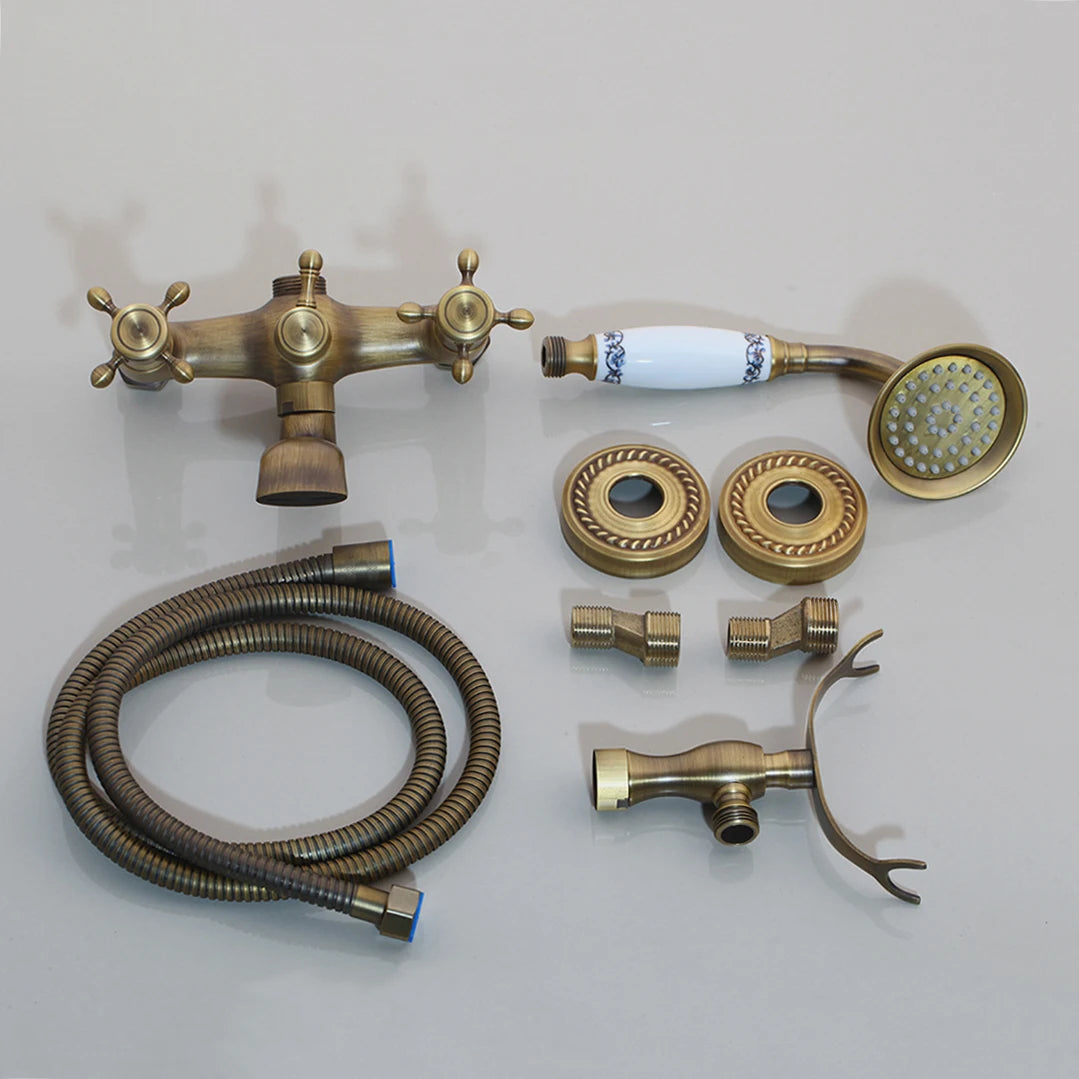 Le mitigeur douche rétro se présente en configuration murale apparente, avec deux poignées latérales, un bec inférieur et une douchette à main reliée par un flexible. Deux finitions sont proposées : or et antique. L’ensemble regroupe les commandes et les sorties d’eau dans un format pensé pour une installation de douche ou de bain-douche.