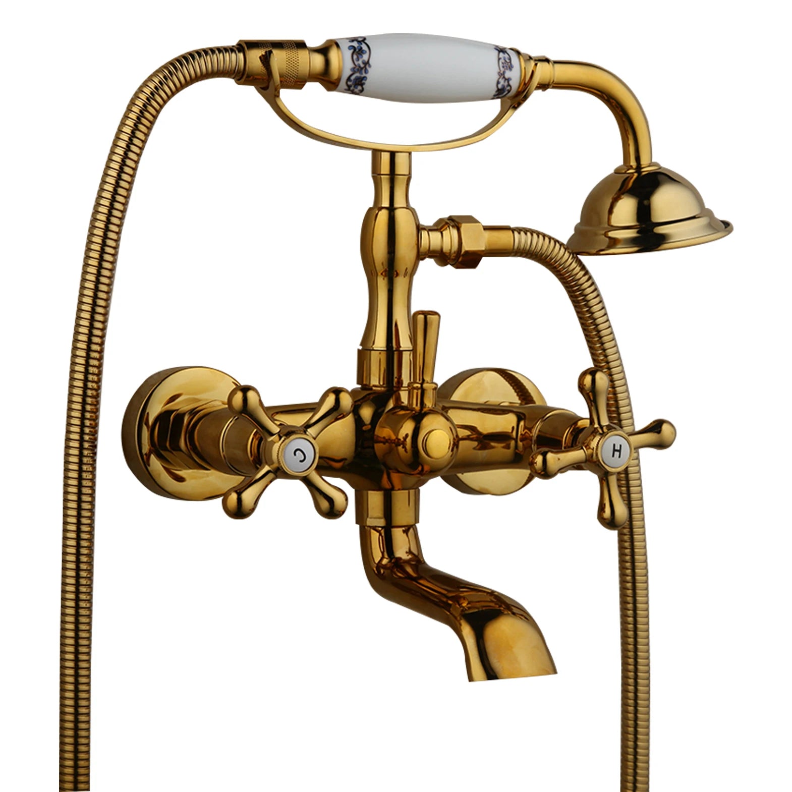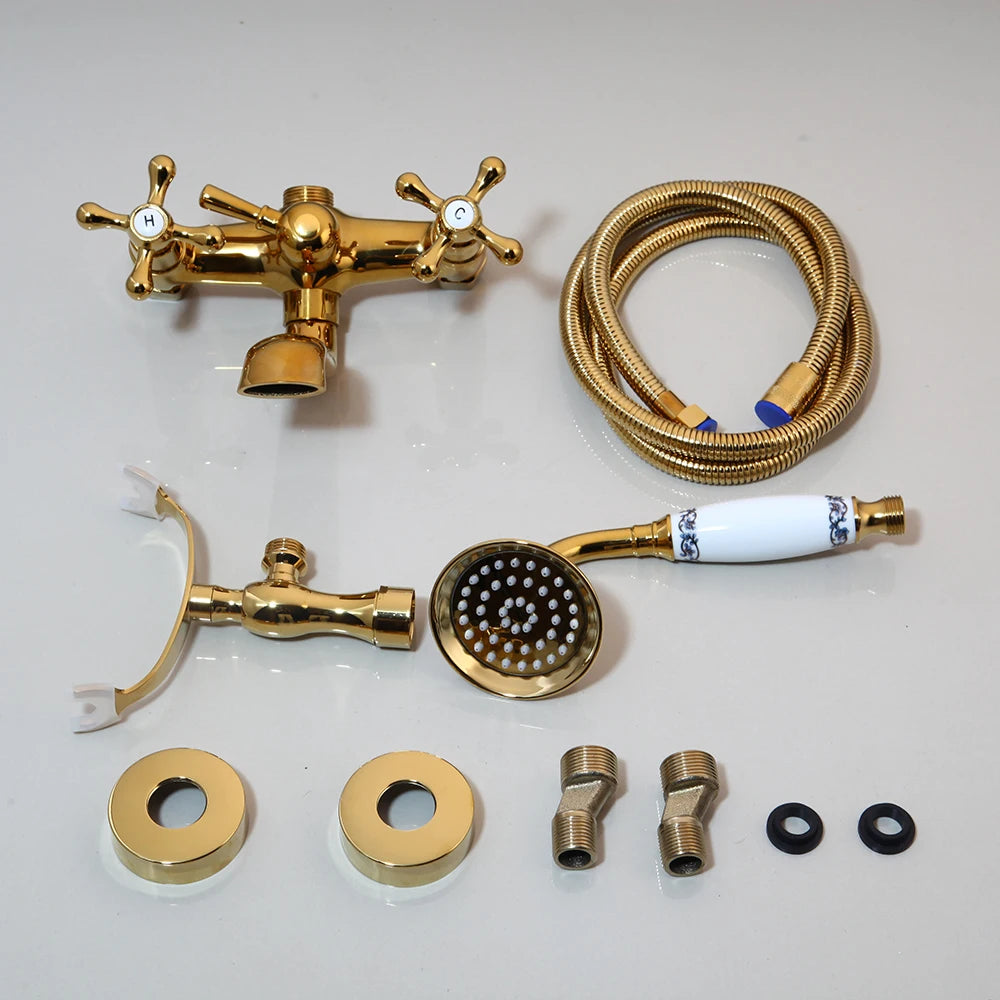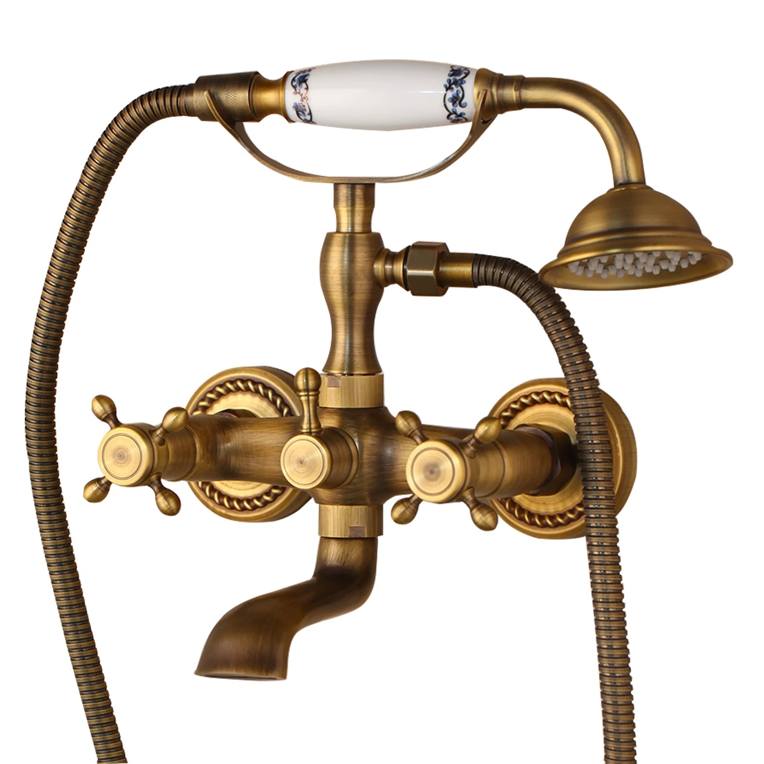 Le mitigeur douche rétro se présente en configuration murale apparente, avec deux poignées latérales, un bec inférieur et une douchette à main reliée par un flexible. Deux finitions sont proposées : or et antique. L’ensemble regroupe les commandes et les sorties d’eau dans un format pensé pour une installation de douche ou de bain-douche.