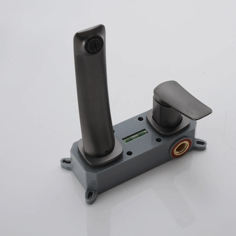 Le mitigeur lavabo encastrable se présente sous la forme d’un robinet mural avec bec apparent et commande unique déportée, tandis que le corps technique est dissimulé dans le mur. Cette configuration permet de libérer l’espace autour du lavabo tout en conservant une installation murale discrète. Trois finitions sont proposées : chrome, gris et or, visibles sur le bec et la poignée.