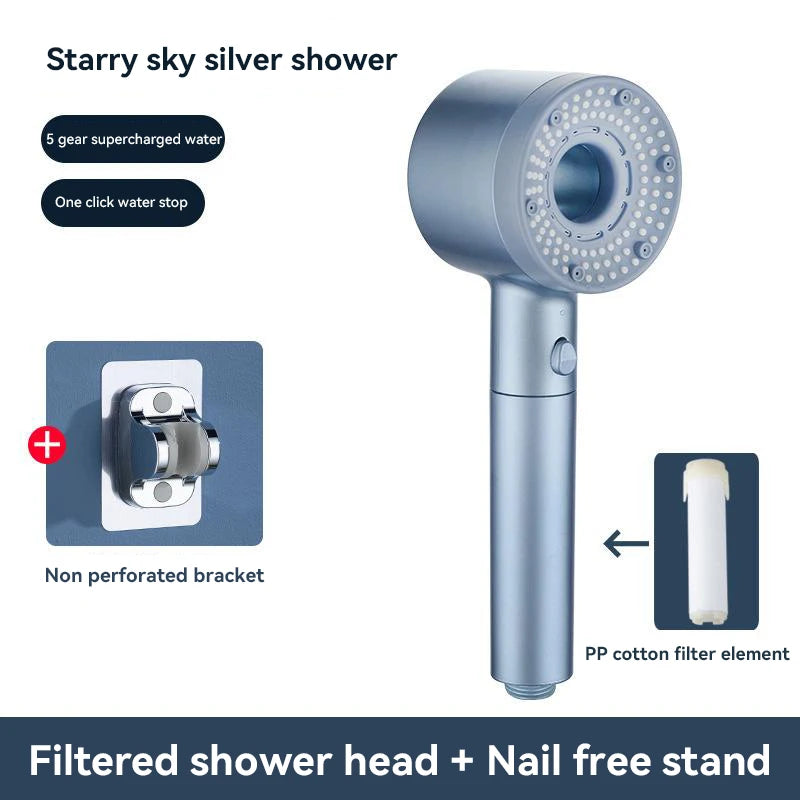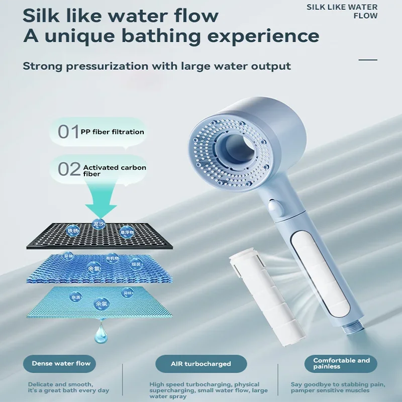 Le pommeau de douche anti calcaire filtre est un modèle tenu à la main, doté d’une tête ronde et d’un manche droit. La face avant présente une surface circulaire avec de nombreuses buses réparties de manière régulière. Un bouton de commande est intégré sur le manche. Le produit est proposé en plusieurs couleurs : bleu, bleu clair et gris. Le format général est compact et allongé.