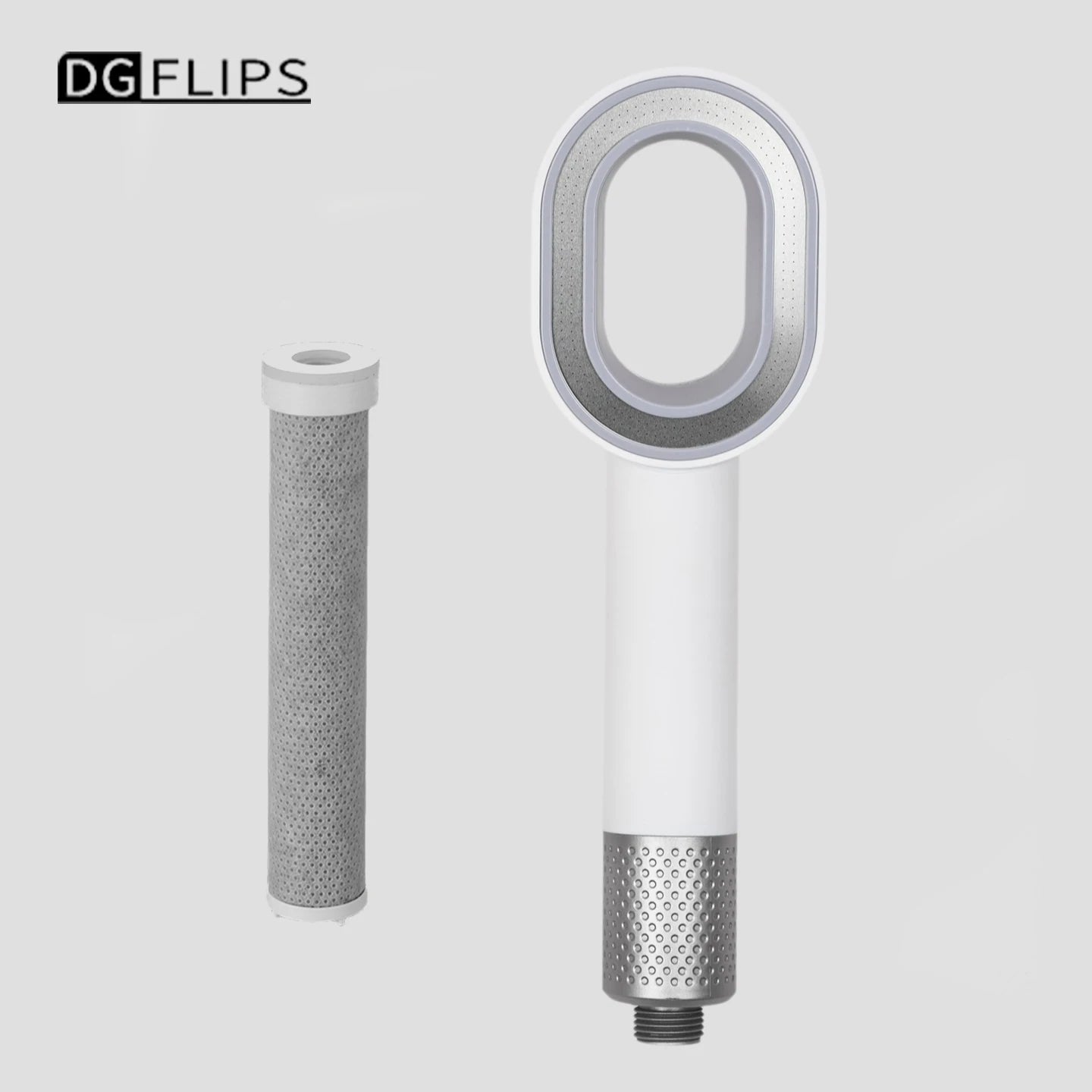 Le pommeau de douche filtrant haute pression est conçu pour une utilisation tenue à la main. La tête adopte une forme arrondie avec une ouverture centrale allongée, visible sur la face frontale. Le corps est fabriqué en plastique ABS et présente une conception monobloc. Le manche intègre un compartiment interne destiné à recevoir un élément filtrant, accessible par dévissage. L’ensemble est prévu pour une installation sur flexible de douche avec un raccord G1/2.