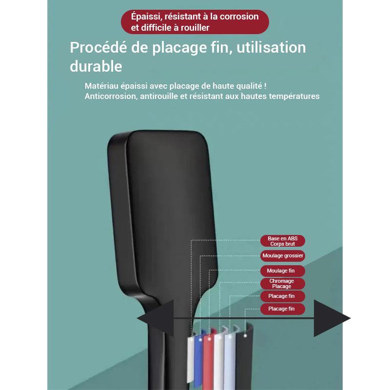 La pommeau de douche haute pression chrome est un modèle tenu à la main, conçu avec une tête de forme carrée et un manche droit. La surface de diffusion intègre de nombreuses buses en silicone réparties sur l’ensemble de la face avant. Le corps est fabriqué en plastique ABS.