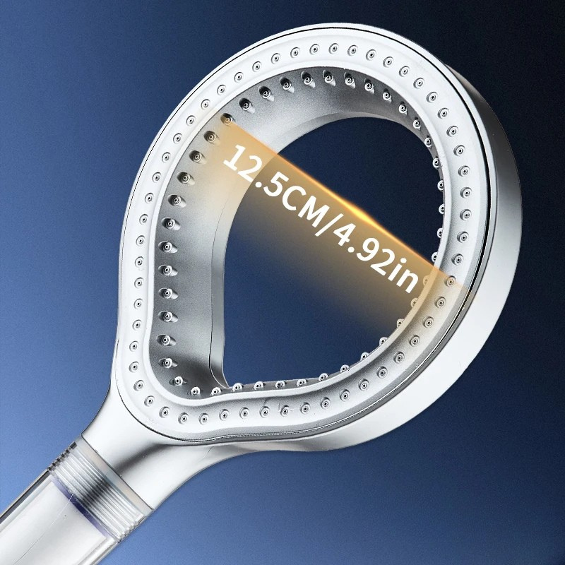 Le pommeau de douche haute pression design adopte une forme annulaire creuse avec une tête ronde ouverte au centre. La sortie d’eau est répartie sur le pourtour, avec des buses en silicone visibles sur la surface interne. Le corps est fabriqué en plastique ABS. Le produit est proposé en trois couleurs, avec deux options de configuration : pommeau seul ou pommeau accompagné de trois filtres.
