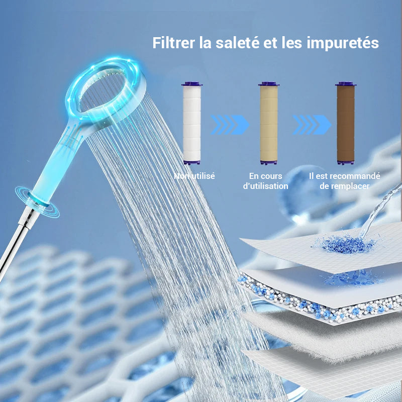 Le jet est de type pluie, diffusé de manière continue par les buses en silicone positionnées autour de l’anneau. Le système de filtration est intégré dans le manche, sous forme de cartouche cylindrique remplaçable. Selon la configuration choisie, le pommeau est livré seul ou avec trois filtres supplémentaires. Le design annulaire facilite l’accès aux buses pour le nettoyage manuel.