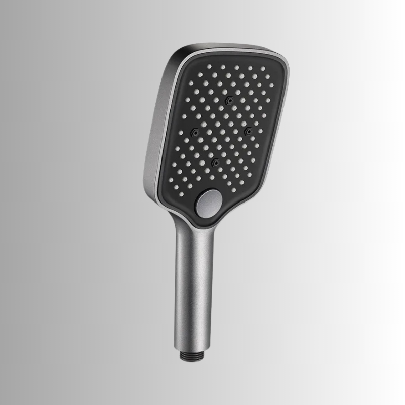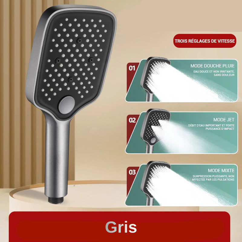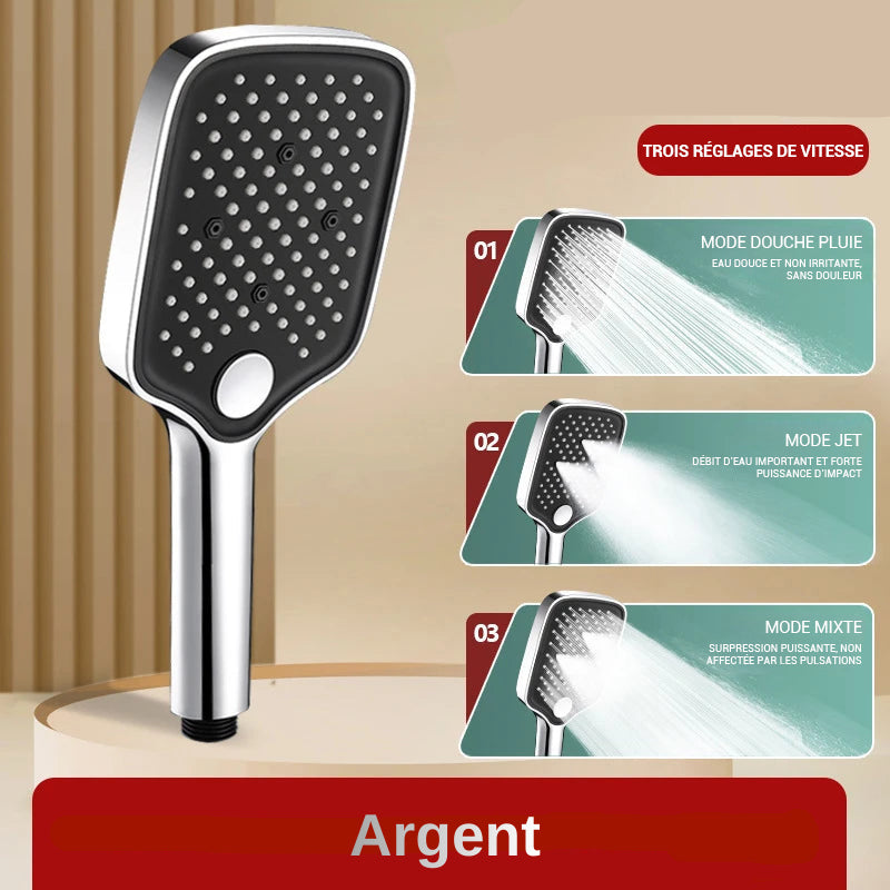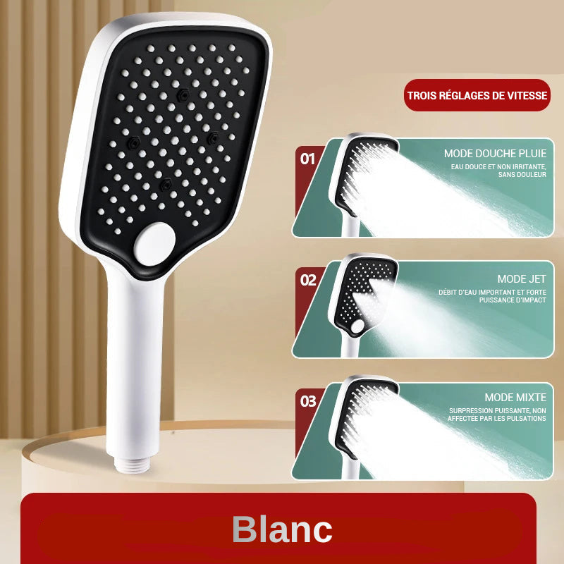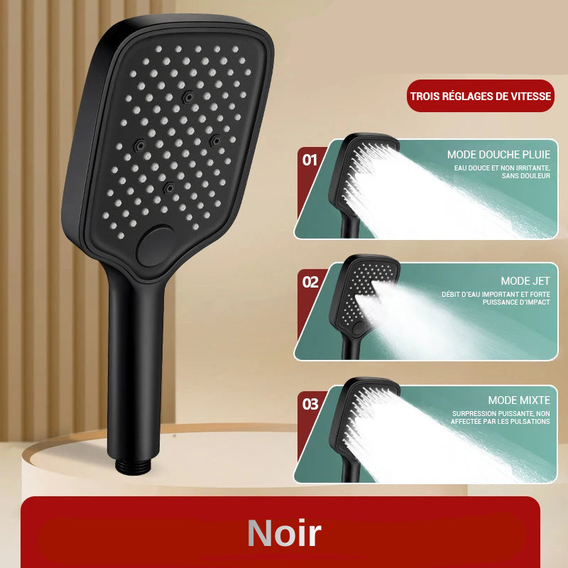 Le pommeau de douche haute pression large dispose de trois modes de jet, sélectionnables à l’aide d’un bouton positionné sur la tête. Chaque mode modifie la configuration de sortie de l’eau, en ajustant la densité et l’orientation des jets.