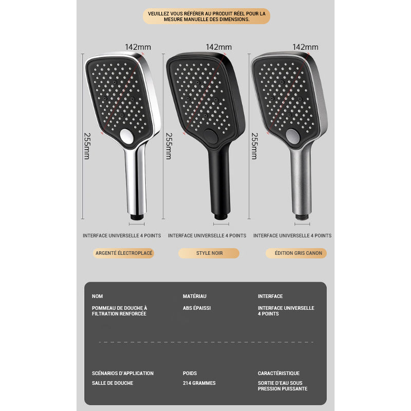 Le pommeau de douche haute pression large adopte une surface de diffusion élargie d’environ 14,2 cm, conçue pour couvrir une zone plus large sous la douche. La tête présente une forme rectangulaire aux angles arrondis, avec une répartition dense de buses en silicone sur l’ensemble de la surface. Le corps est fabriqué en plastique et une prise en main adaptée à une utilisation quotidienne. Le pommeau est proposé en noir, blanc, argent et gris, permettant une intégration dans différents styles de salles de bain.